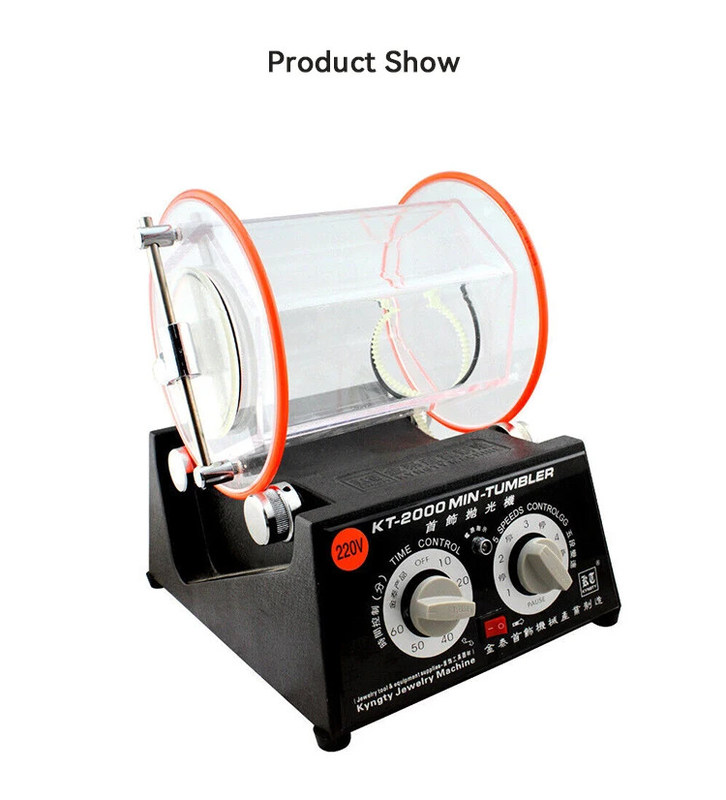 보석 연마기에는 600g의 유리통이 장착되어 있어 많은 용량의 보석 조각을 한 번에 연마할 수 있습니다. 이는 한 번에 여러 장신구를 연마하는 데 이상적이며 시간을 절약하고 효율적인 도구입니다. 180mm의 기계 크기 덕분에 다양한 크기와 모양의 보석을 연마하는 데에도 적합합니다.